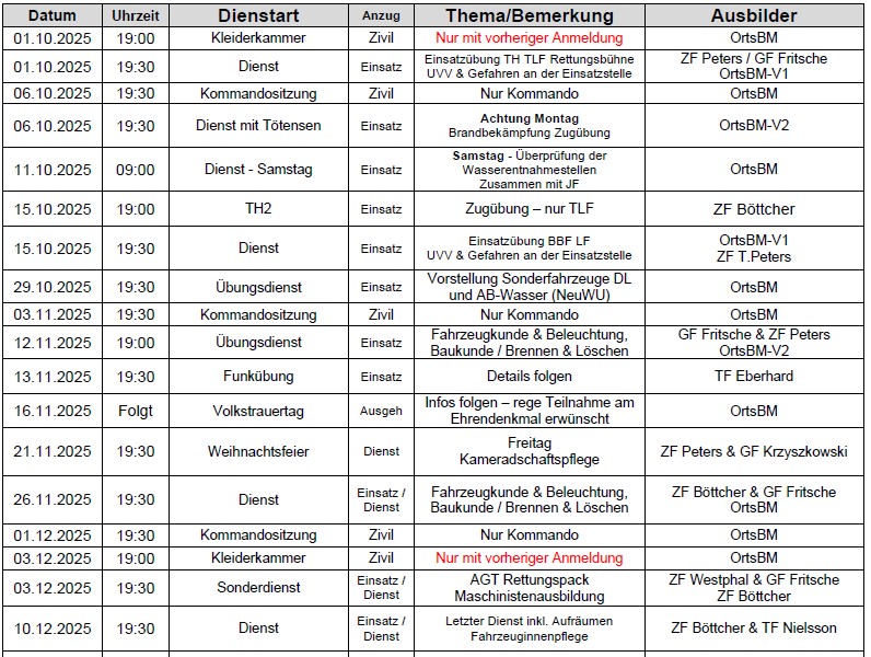 Die angegebene Uhrzeiten bezieht sich auf den jeweiligen Beginn am Übungsort.