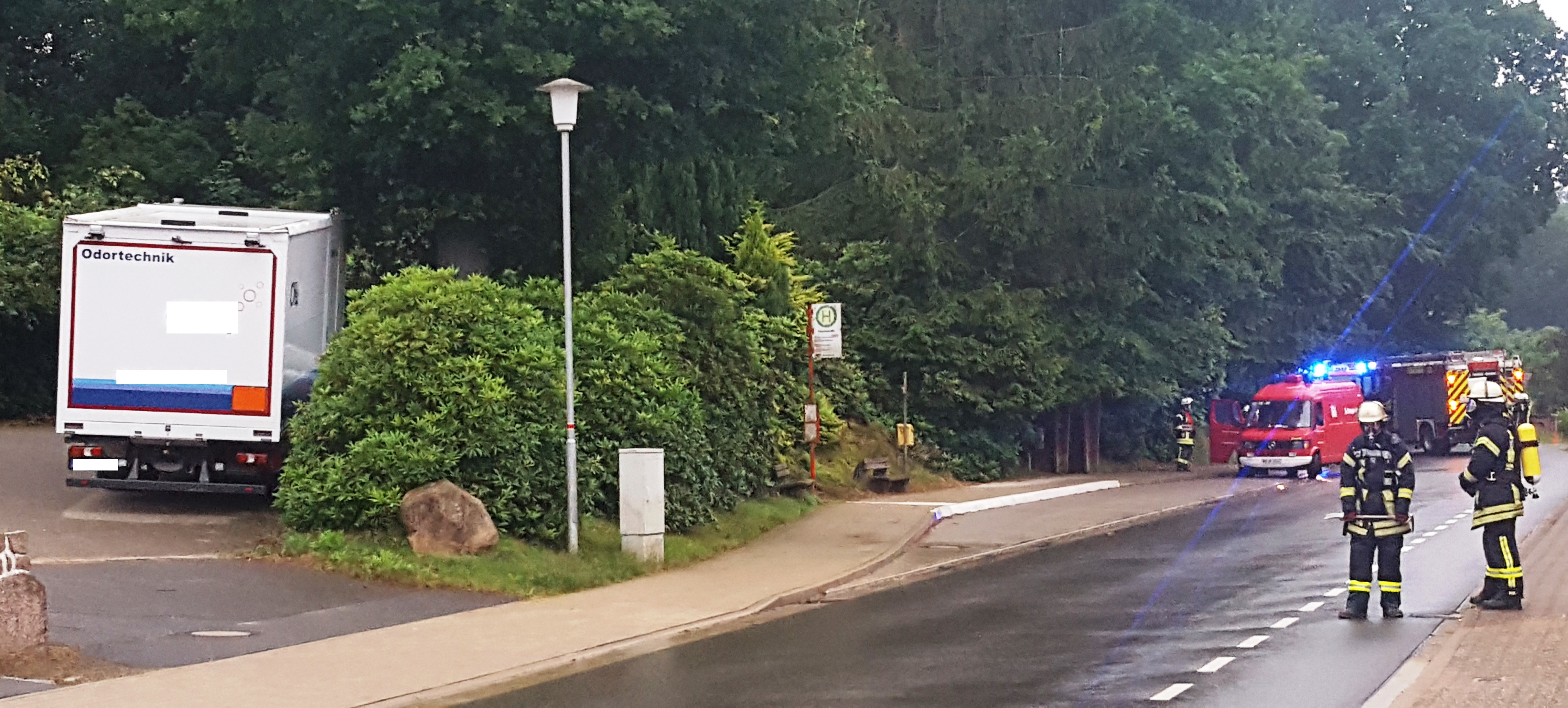 Nach Eintreffen der ersten Kräfte konnte festgestellt werden, dass ein LKW auf einem Hotelparkplatz abgestellt war, an dem eine Gefahrgut-Warntafel zu erkennen war. Außerdem war das Fahrzeug mit einem Schriftzug "Odortechnik" versehen. Daraus konnten dann schnell die ersten Schlüsse gezogen werden. Odoierung bedeutet, dass ein extrem stark riechender Stoff dem Erdgas zugegeben wird um dies riechbar zu machen.