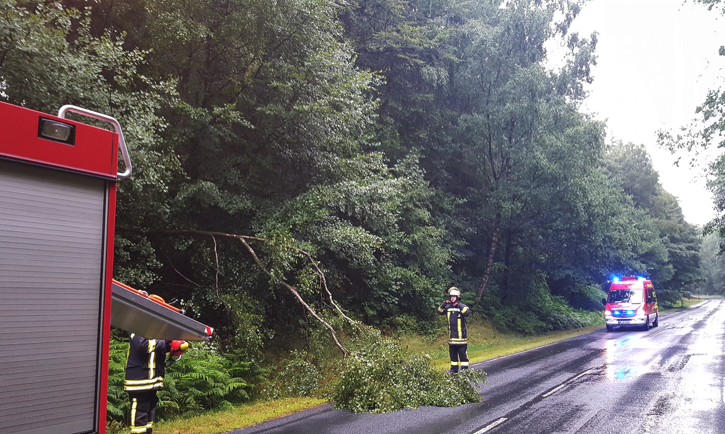 Bedingt durch die starken Regenfälle am Mittwoch und die damit verbundene Last auf den Bäume neigte sich eine Birke über die Fahrbahn der K26 Richtung Langenrehm. Das Bäumchen wurde fachgercht zerlegt, sodass nach kurzer Zeit die Fahrbahn wieder frei war und wir wieder einrücken konnten.
