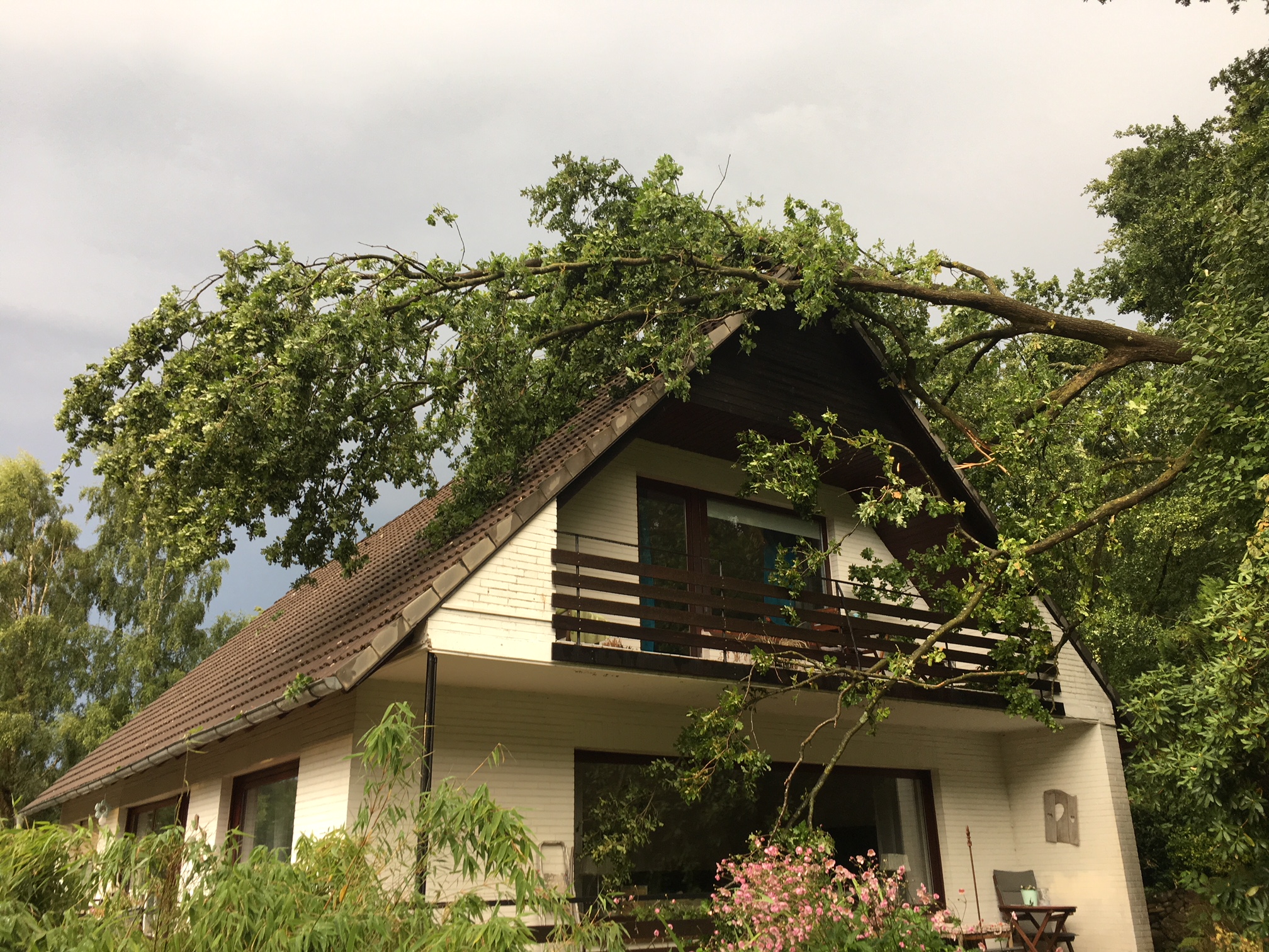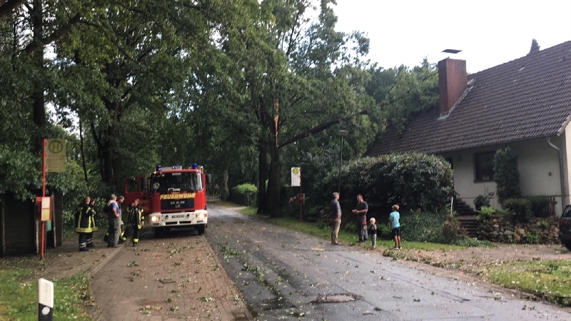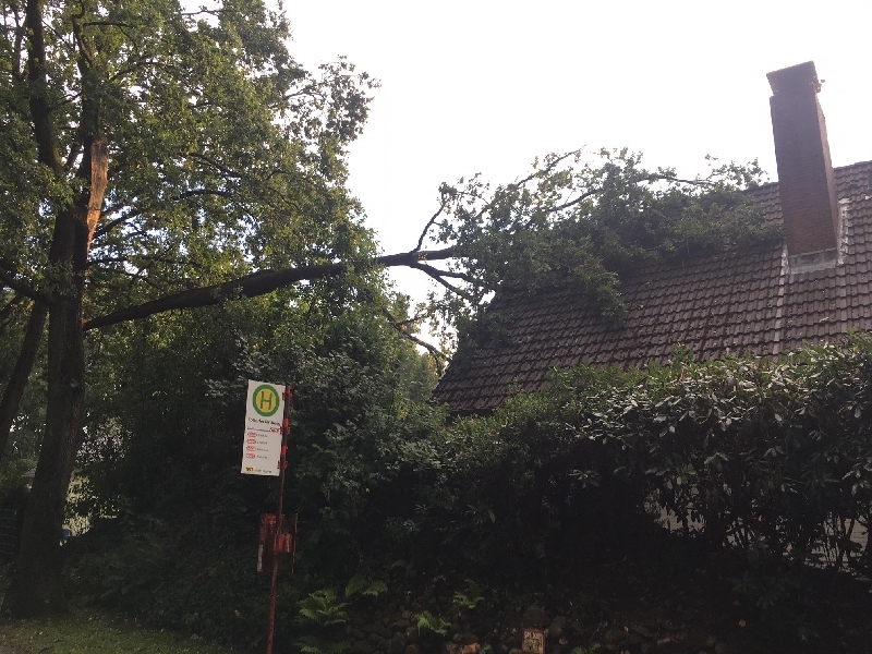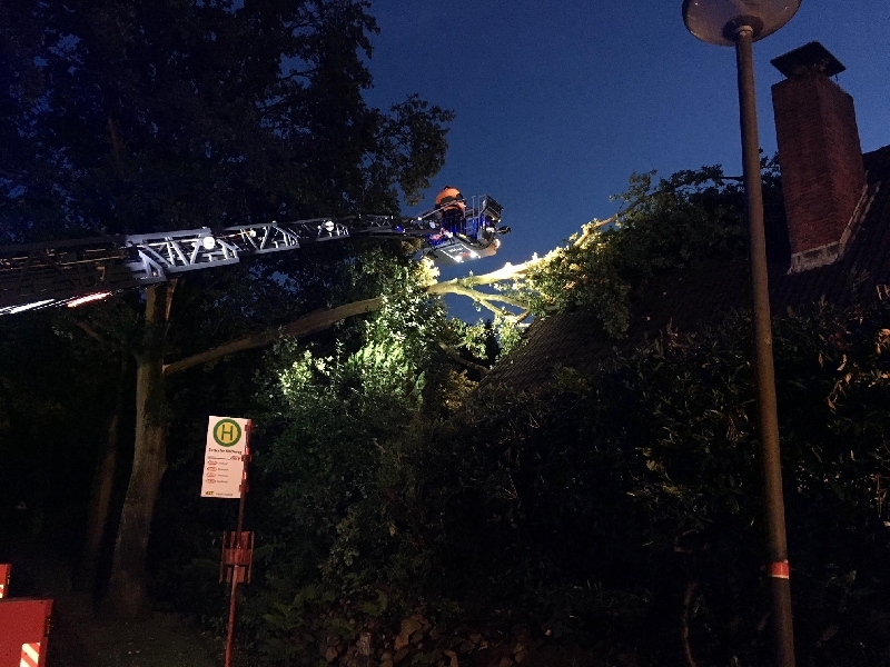 An dieser Einsatzstelle waren zweifellos die Schutzengel sehr wachsam. Während des Gewittersturmes spielten die Kinder des Eigentümers in ihrem Kinderzimmer unter dem Dach, als an einem Strassenbaum ein dicker Ast abbrach und auf das Dach des Wohnhauses fiel. Die Dachhaut wurde zum Glück nur leichtbeschädigt, sodass auch die Kinder im Inneren nicht zu Schaden kamen. Zur Unterstützung an dieser Einsatzstelle wurde eine Drehleiter nach gefordert. Auf Grund der hohe Einsatzzahlen rückte dann die DL der FF Neu Wumlstorf an die Einsatzstelle an. In Kleinarbeit wurde dann Stück für Stück der Ast vom Dach des Hauses entfernt. Nach 3 Stunden war diese Einsatzstelle dann abgearbeitet.