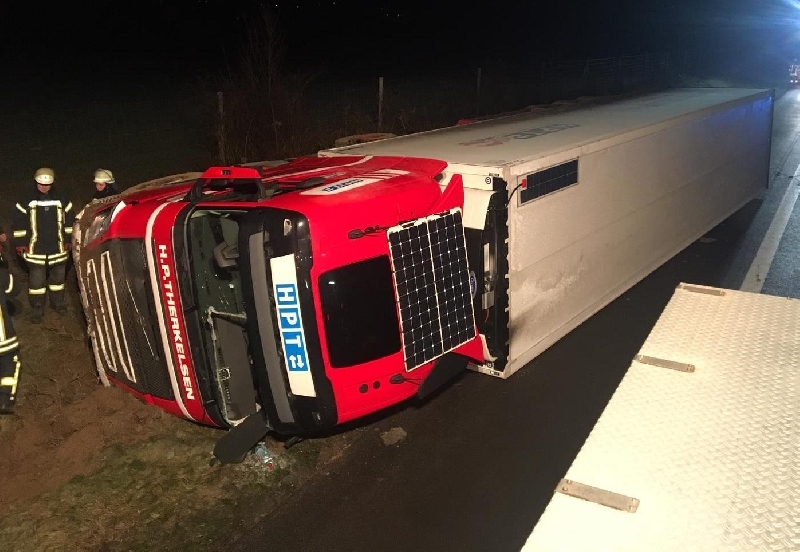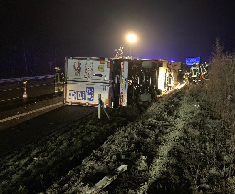 Auf der BAB A261 Fahrtrichtung Bremen war in Höhe Kilometer 6,0 ein mit Lebensmitteln beladener Tiefkühl-Sattelauflieger von der Fahrbahn abgekommen und im losen Untergrund des Seitenstreifens auf die Fahrerseite gekippt.
