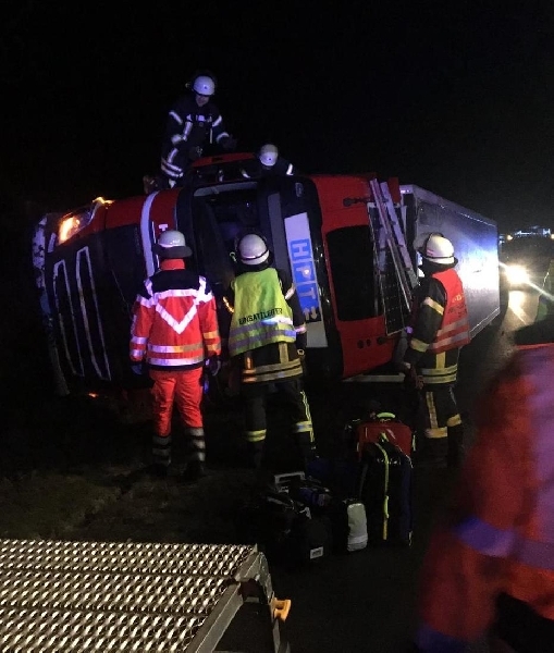 Die Kommunikation wurde in Englisch durchgeführt und brachte daher keine Probleme. Beide Insassen erlitten einen Schock. Da auch Verletzungen an den Beinen vorlagen, entschied der Einsatzleiter einen Zugang mittels Spezialsäge, durch die Windschutzscheibe herzustellen. Hierdurch erfolgte dann auch auch die technische Rettung der beiden Personen, die anschließend durch den RD in umliegende Krankenäuser verbracht wurden.