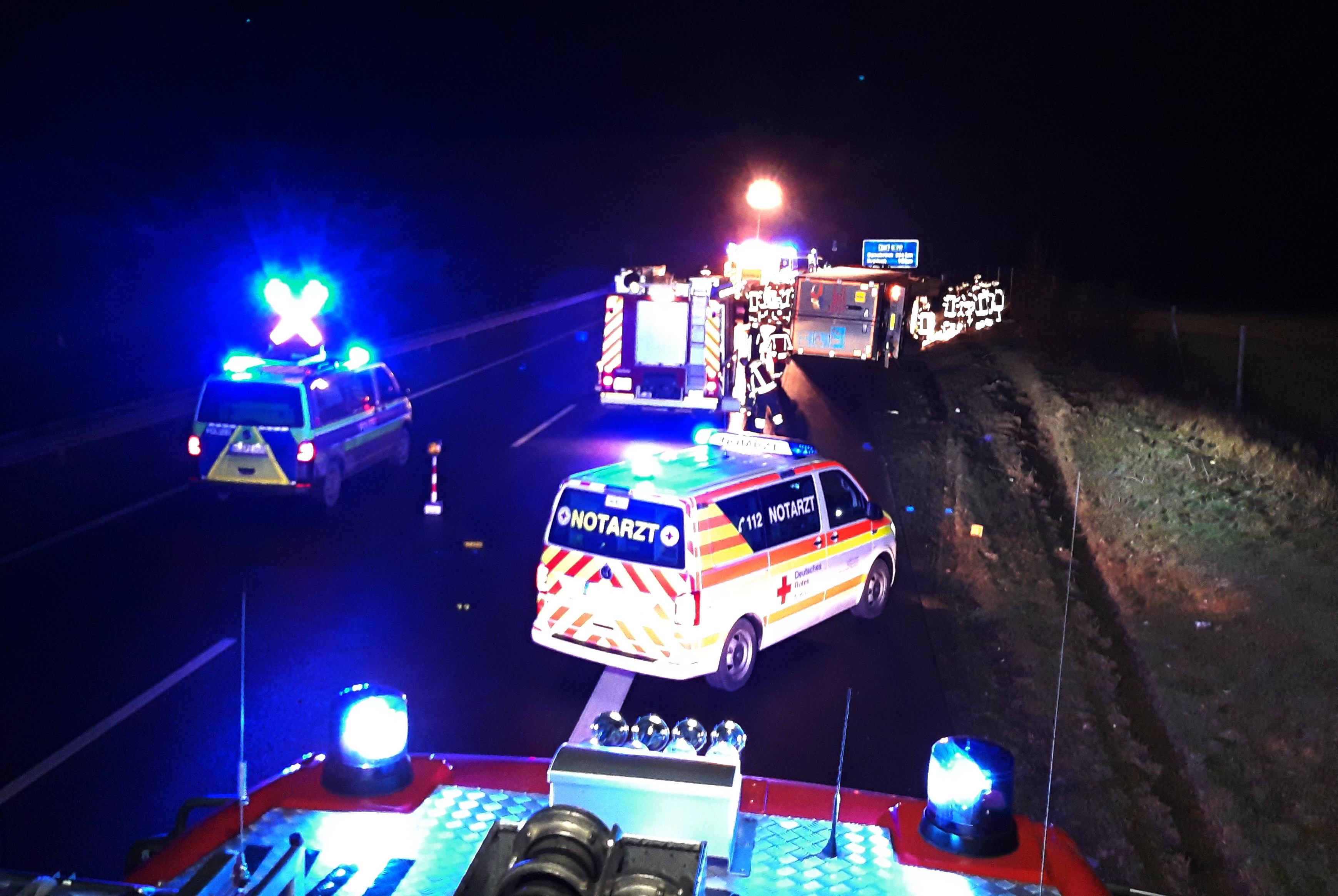 Parallel wurde der Brandschutz sichergestellt und die Einsatzstelle für die Unfallaufnahme der Polizei ausgeleuchtet. Glücklicherweise blieben die Fahrzeugtanks unbeschädigt. Allerdings tropfte ein wenig Kraftstoff aus dem Tankdeckel des Kühlaggregates. Dies wurde abgedichtet und ausgelaufene Betriebstoffe abgestreut. Nach ca. 1,5 Stunden wurde die Einsatzstelle an die Polizei übergeben. Die Bergungsarbeiten auf der vollgesperrten Autobahn zogen sich bis in den Vormittag hin.