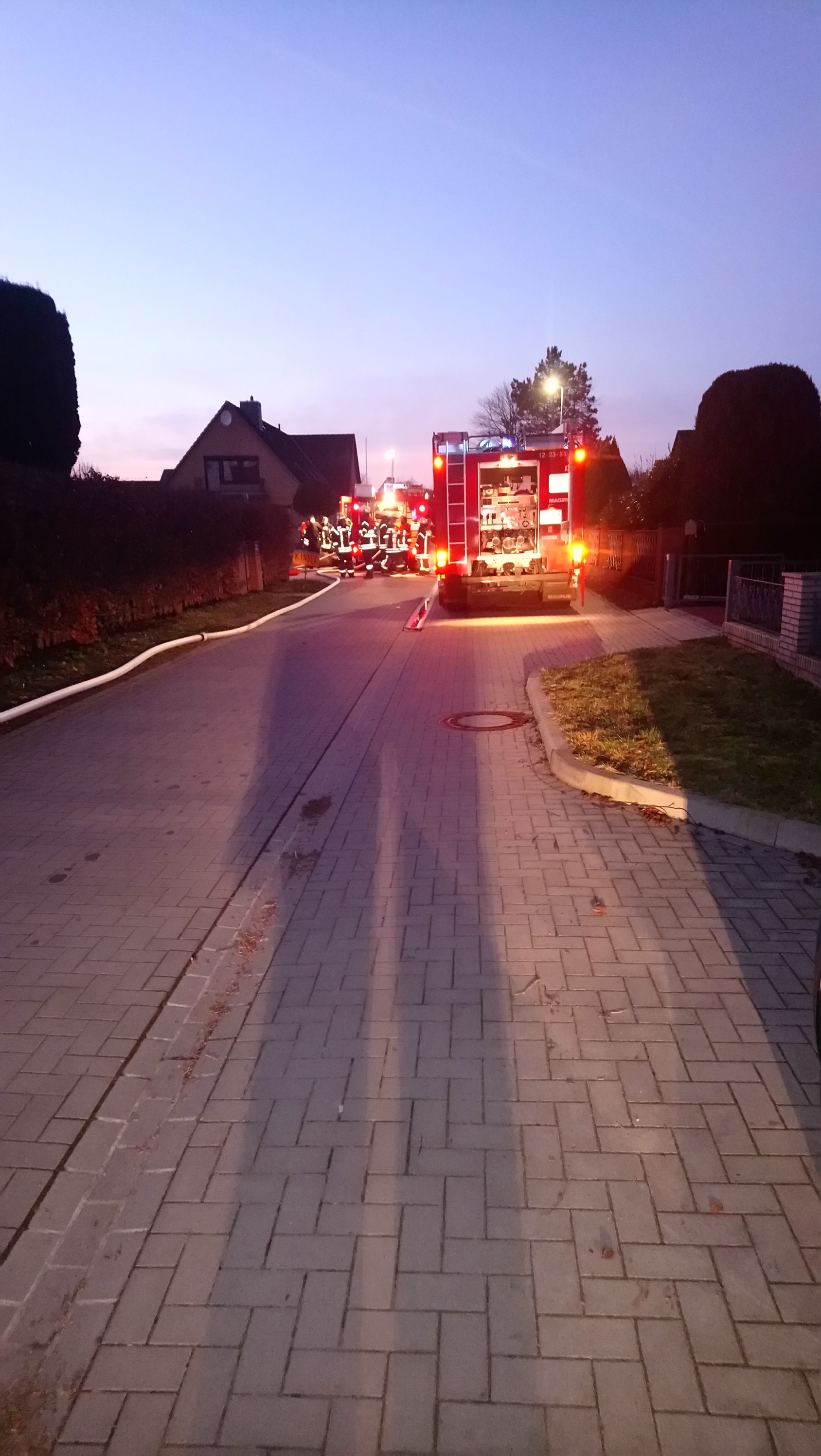 Im Außenbereich wurden zwischenzeitlich 2 C-Rohre bereitgestellt, sowie ein 2. Angriffweg über eine Steckleiter hergestellt (Anleiterbereitschaft).