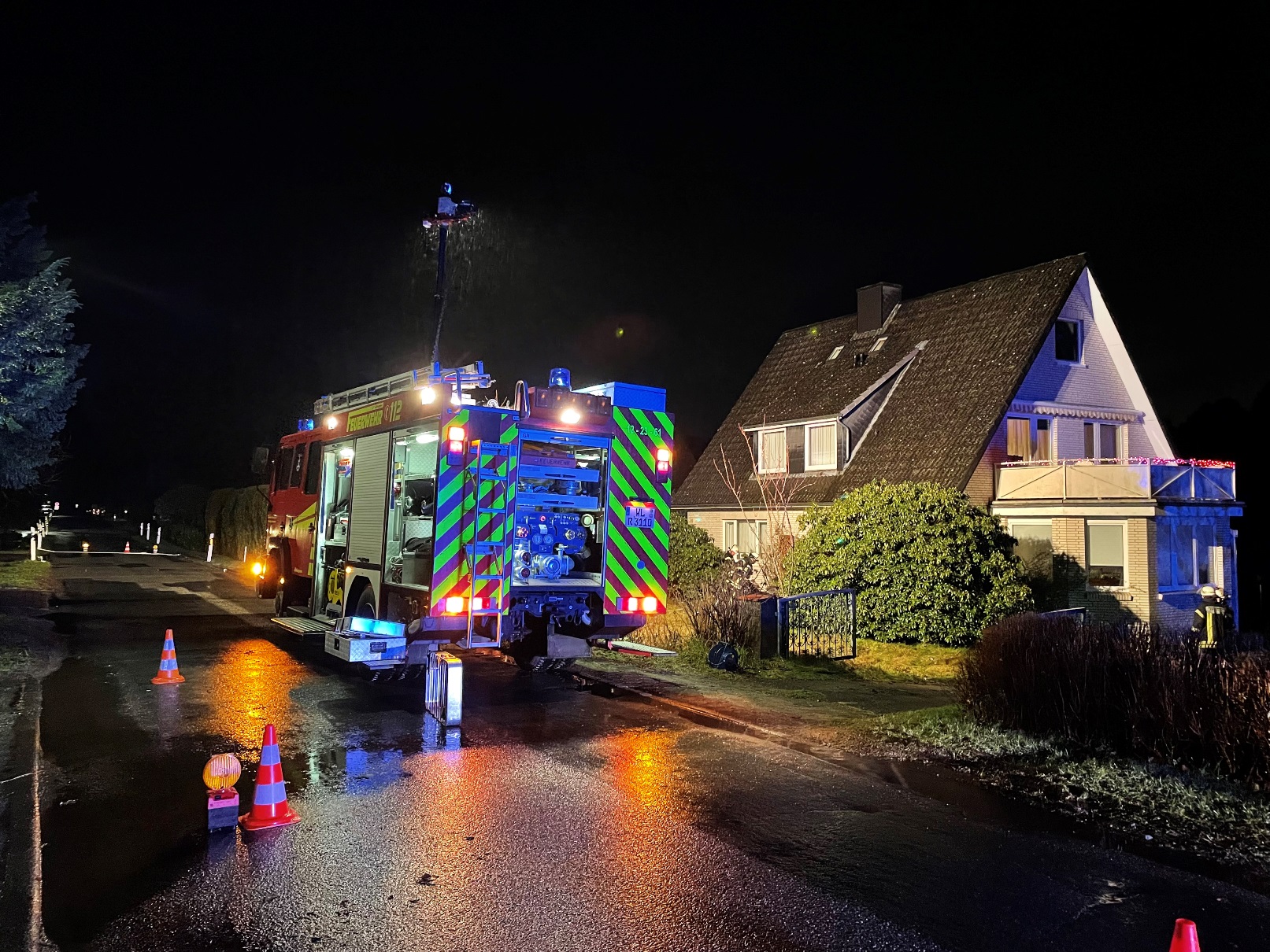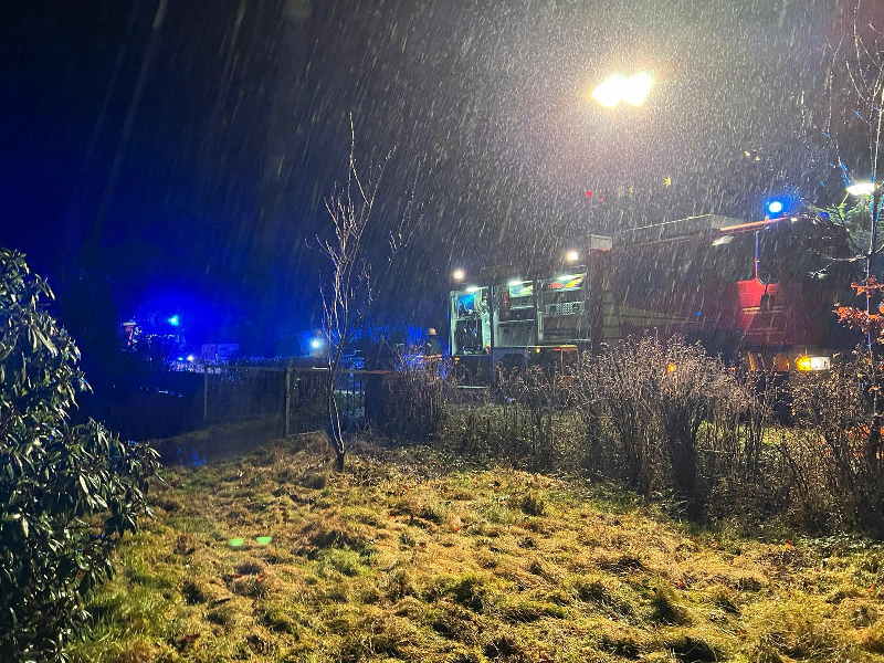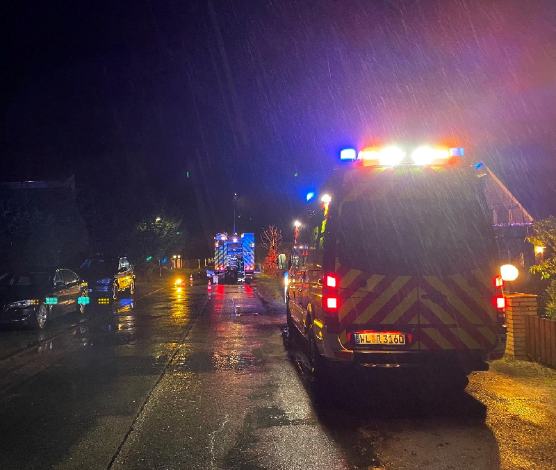 Zu einem für Silvester eher untypischen Einsatz wurden wir am frühen Abend nach Neu Leversen alarmiert. Dort hatte sich auf Grund der starken Regenfälle der vorangegangenen Tage und Stunden, das Erdreich vor einem Wohnhaus komplett mit Wasser gesättigt, sodass dieses nun in die Kasematten des Hause lief. Schließlich gaben dann die Dichtung der Kellrfenster nach und der Keller stand ca. 10 cm unter Wasser. Mittels Tauchpumpe und einem Wassersauger wurde dier Keller dann trocken gelegt. Da der Regenfall noch weiterhin stark anhielt, wurde ein kleiner Graben vor dem Haus errichtet, damit das Wasser was von der höhergelegenen Strasse auf das Grundstück lief, ohne weiteren Schaden abgeleitet werden konnte.