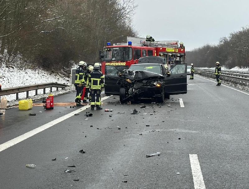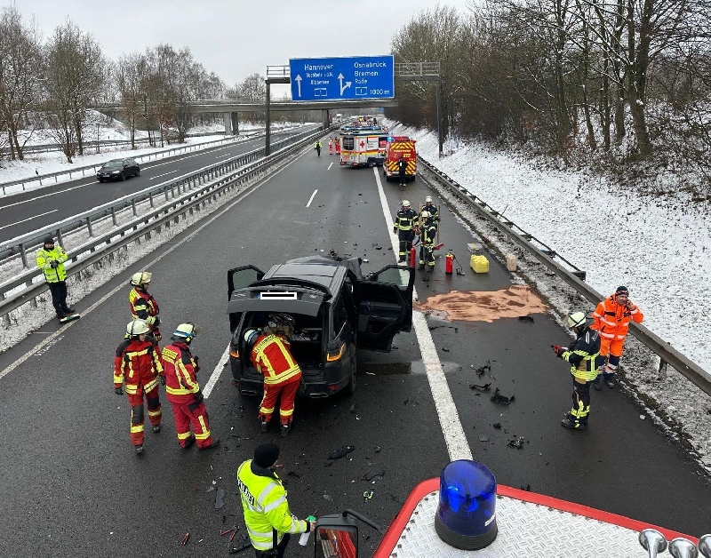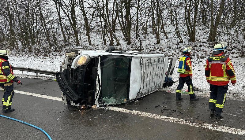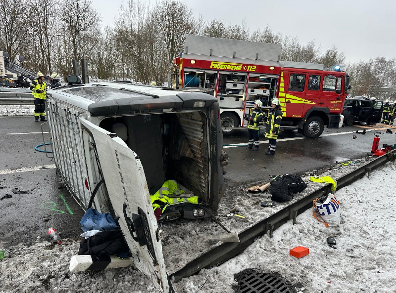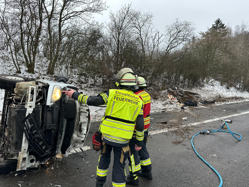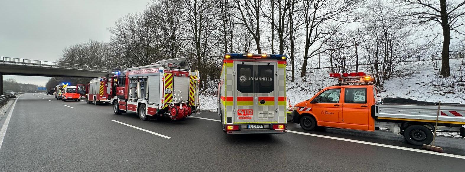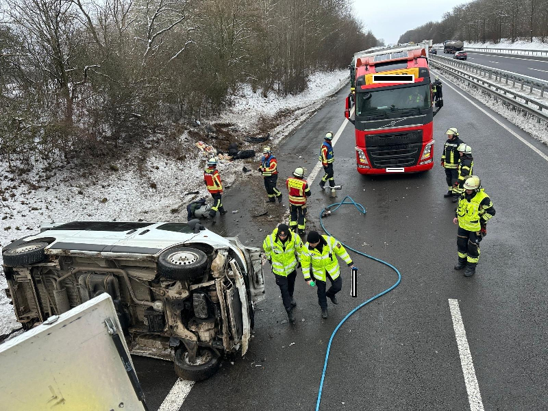 Nach Eintreffen der ersten Kräfte konnte schnell Entwarnung gegeben werden. Es waren keine Personen eingeklemmt und auch kein LKW am Unfallgeschehen beteiligt. Den Kräften bot sich eine Lage mit insgesamt 3 beteiligten Fahrzeugen. Ein Kleinbus hatte sich augenscheinlich im Böschungsbereich überschlagen und lag auf dem Seitenstreifen auf der Seite. Davor befand sich auf der Hauptfahrspur ein Geländewagen Range Rover mit erheblichem Frontschaden, und etwas weiter stand noch ein Geländewagen Mercedes mit Heckschaden. Große Mengen Betriebsstoffe waren ausgelaufen.