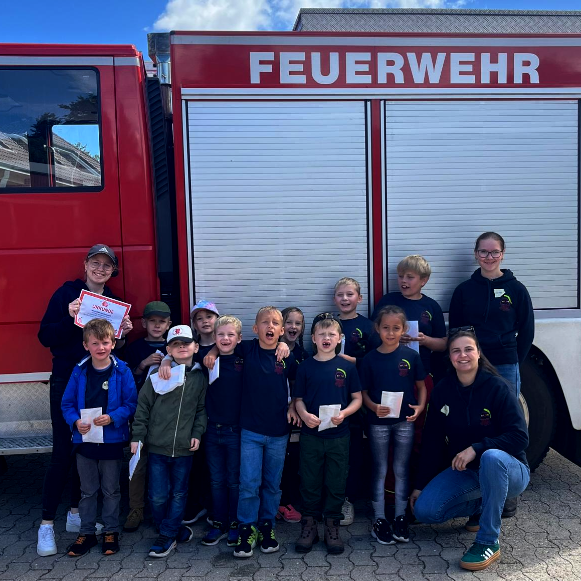 Die offizielle Gründung der Kinderfeuerwehr (KF) fand bereits am 01. Juni 2024 statt. Am 11. September 2024 startete der Dienstbetrieb unter der Leitung von Yasmin Wiener mit sieben Kindern. Rabea Peters war ebenfalls “Frau“ der ersten Stunde in der Betreuung der „Feuerquallen“, so der Name der KF. Mittlerweile sind 11 Kinder, darunter 1 Mädchen, Mitglied der Kinderfeuerwehr. Als weitere Betreuerinnen konnten Manuela Hillmer und Elina Erdmann gewonnen werden. Alle 14 Tage findet am Mittwoch ab 17 Uhr der Dienst am Gerätehaus in Leversen statt.